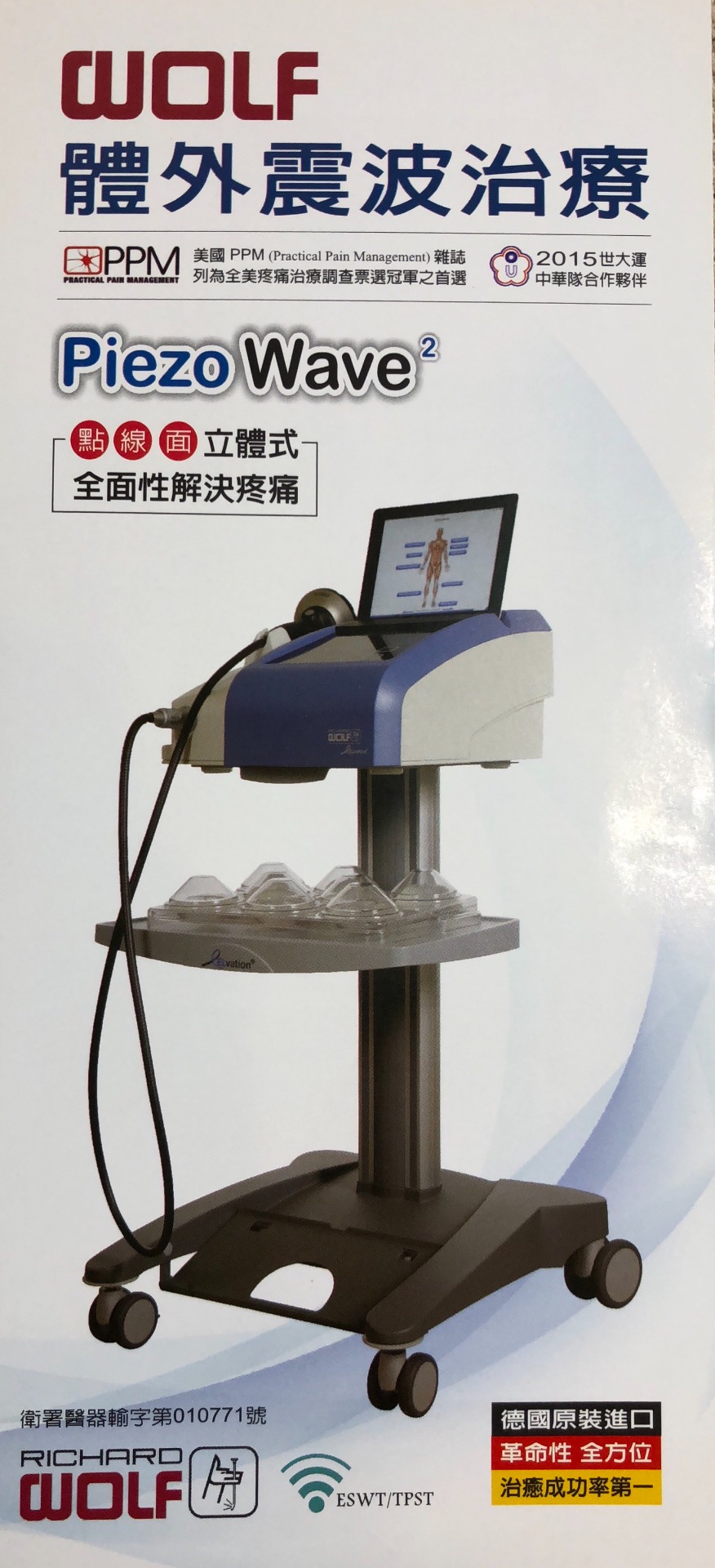 體外震波又稱為骨震波、ESWT,為骨科復健頑疾傷患的有效治療方法之一。引進德國Wolf高階體外震波儀,使用精準聚焦式探頭,透過重複震盪方式,針對慢性疼痛組織損傷部位給予高能量震波,促進組織細胞啟動修復機轉,促使自體組織細胞循環、修復與再生的新型態療法。