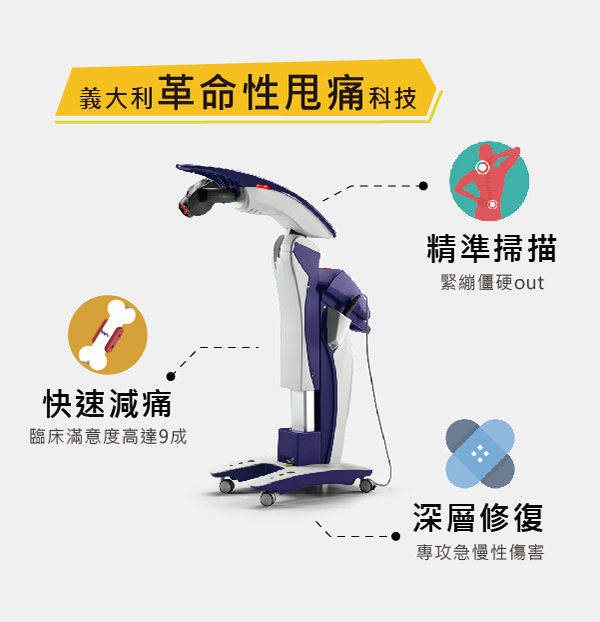 本治療所引進義大利知名高能量雷射儀器商ASA研發的「除痛機器人」,運用全方位機械手臂搭配AI雷射雙波掃瞄系統,大範圍精準掃除疼痛,修復受損組織,快速緩解疼痛。