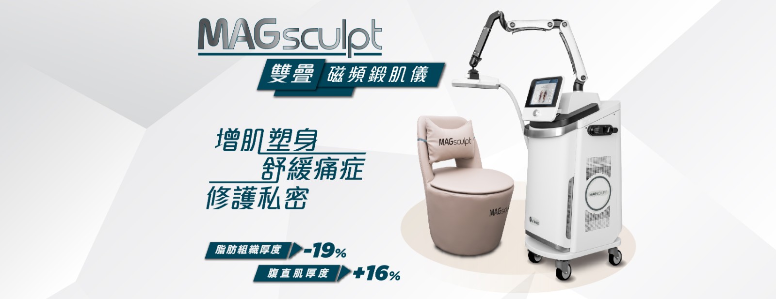MAGsculpt的物理治療模式能夠訓練肌肉、放鬆關節、增加血液循環、促進身體代謝,有助改善肩頸痛、腰痛、背痛、彈弓手、麻痺腫痛、肌肉無力、長期姿勢不正確等引起的痛症。